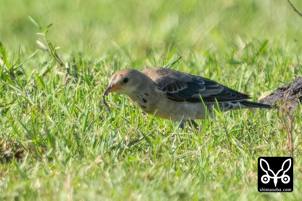 なにかの幼虫を捕まえたバライロムクドリ。