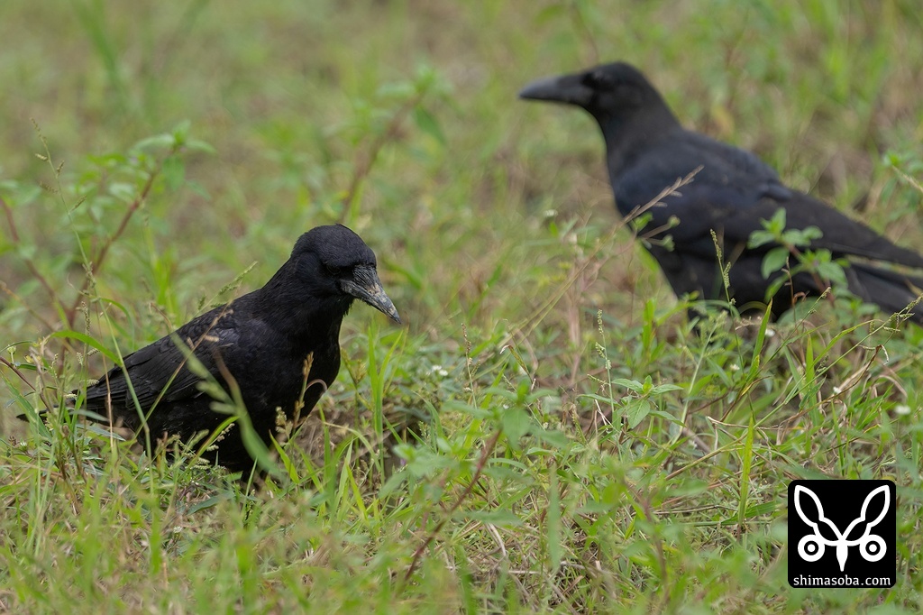 ミヤマガラス(左)とオサハシブトガラス。ハシブトガラスよりはミヤマガラスの方が一回り小さいのですが、オサハシブトガラスは小さな亜種なので、ミヤマガラスとほとんど同じ大きさでした。