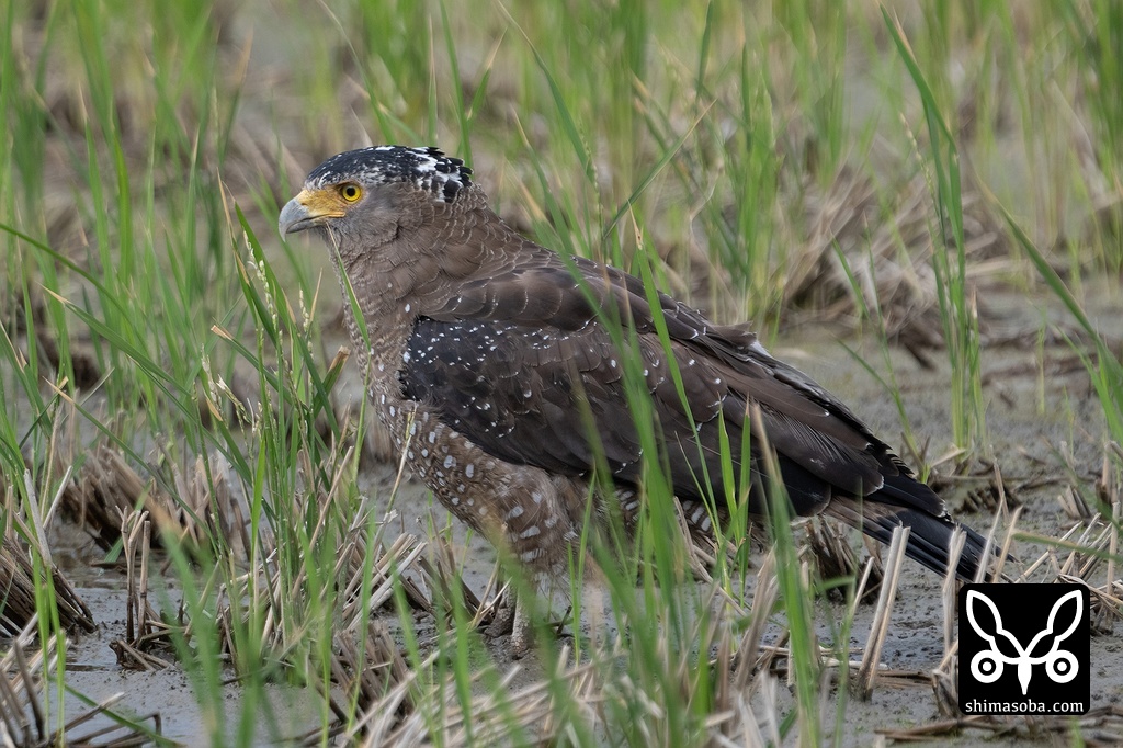 田んぼで餌をとるカンムリワシ。うろうろ歩き回っていました。