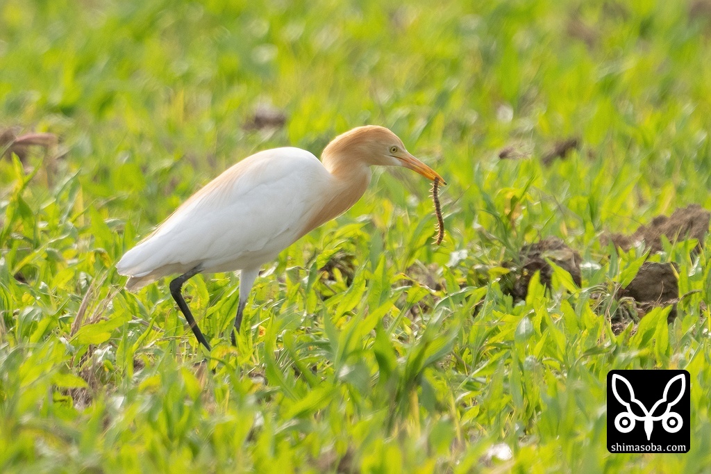 ムカデを捕まえたアマサギ。100羽近くが旅の合間に滞在中。