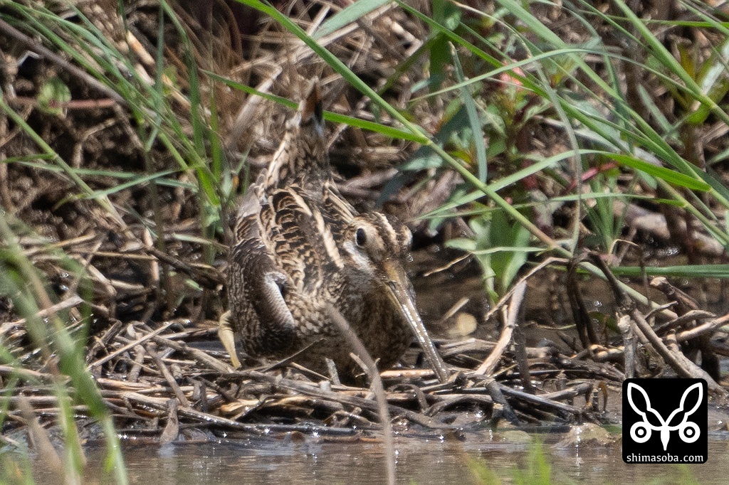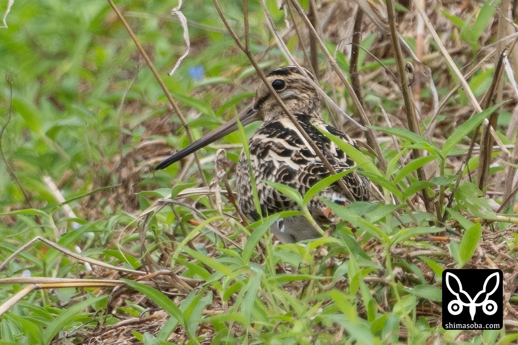チュウジシギ数羽に交じりながら、あぜを歩き回って餌を取っていたハリオシギ。