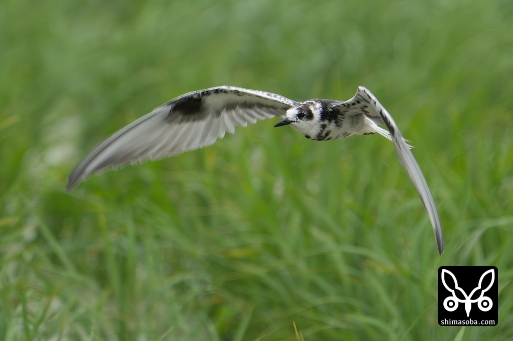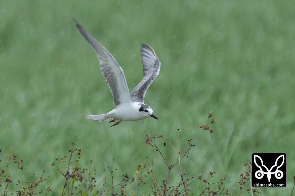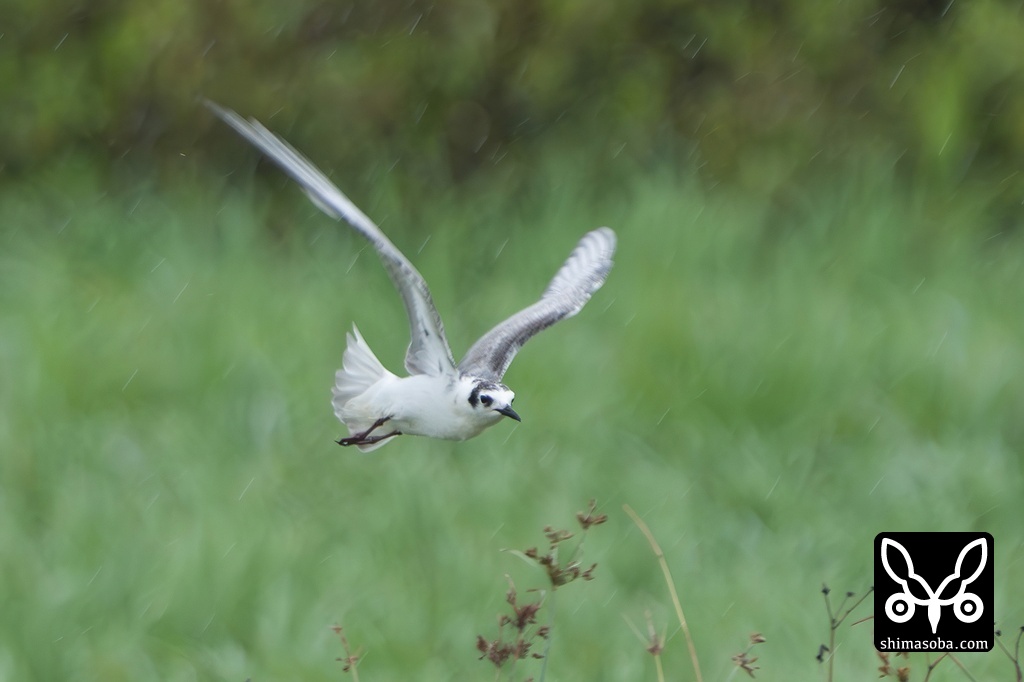 ハジロクロハラアジサシは台風の余波が残る強風の中、田んぼの上を飛び回りながらトンボを捕まえていました。