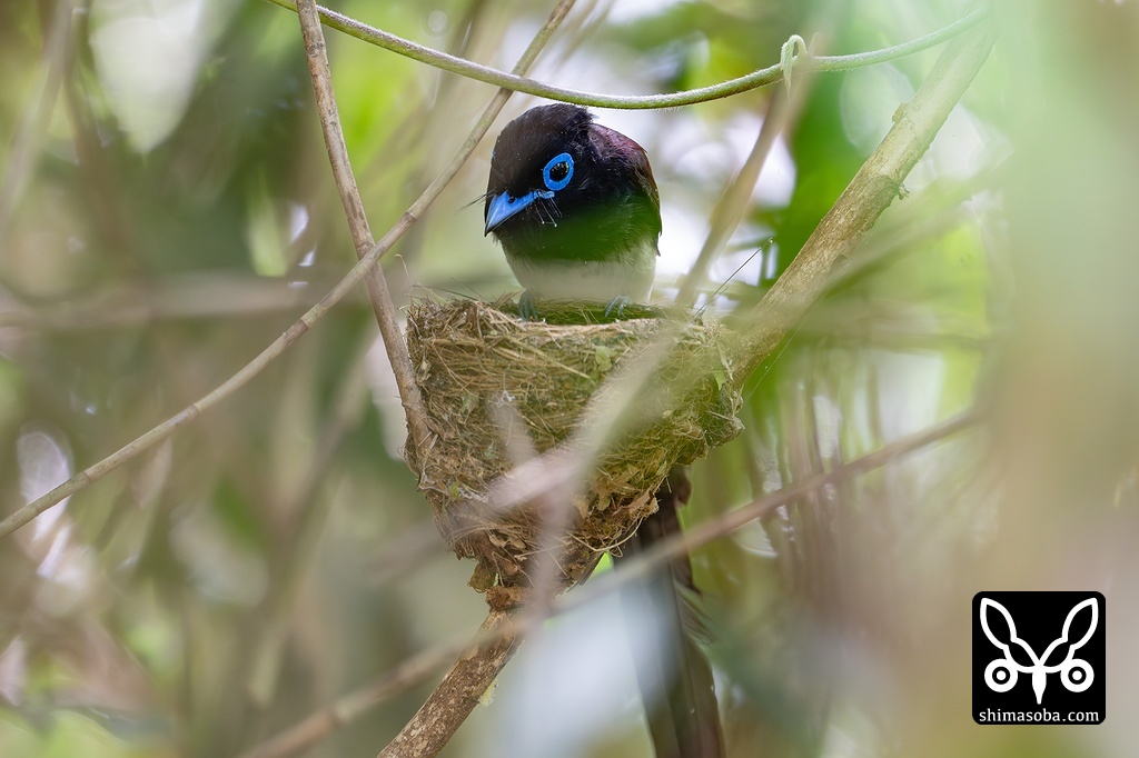 サンコウチョウのオスが巣に餌を持ってきた。小さなクモやガなのでヒナはまだ小さいようです。