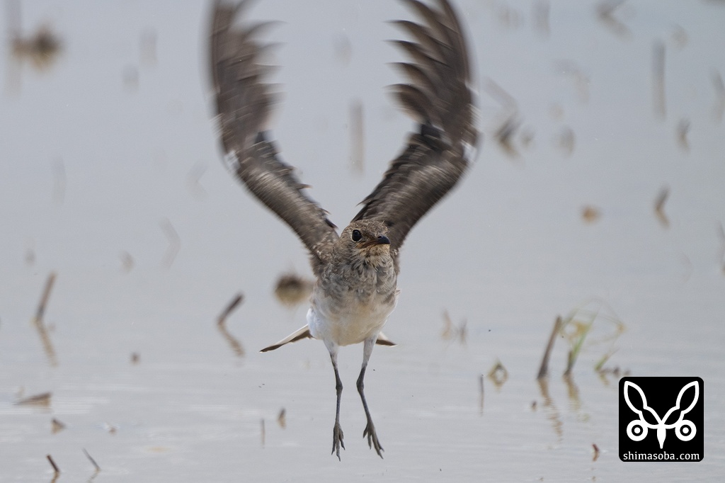 水浴び後、羽ばたいて水切りするツバメチドリの幼鳥。
