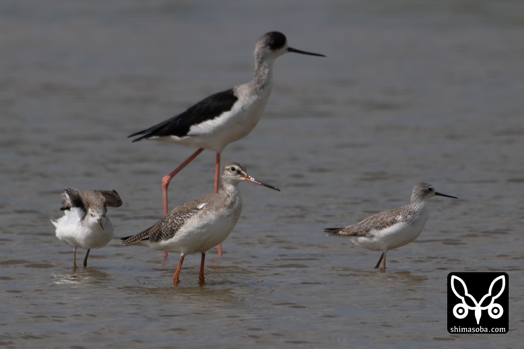 ツルシギは第1回冬羽。コアオアシシギと仲良しでした。