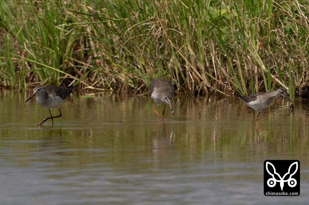 アカアシシギとタカブシギはならんで採餌。