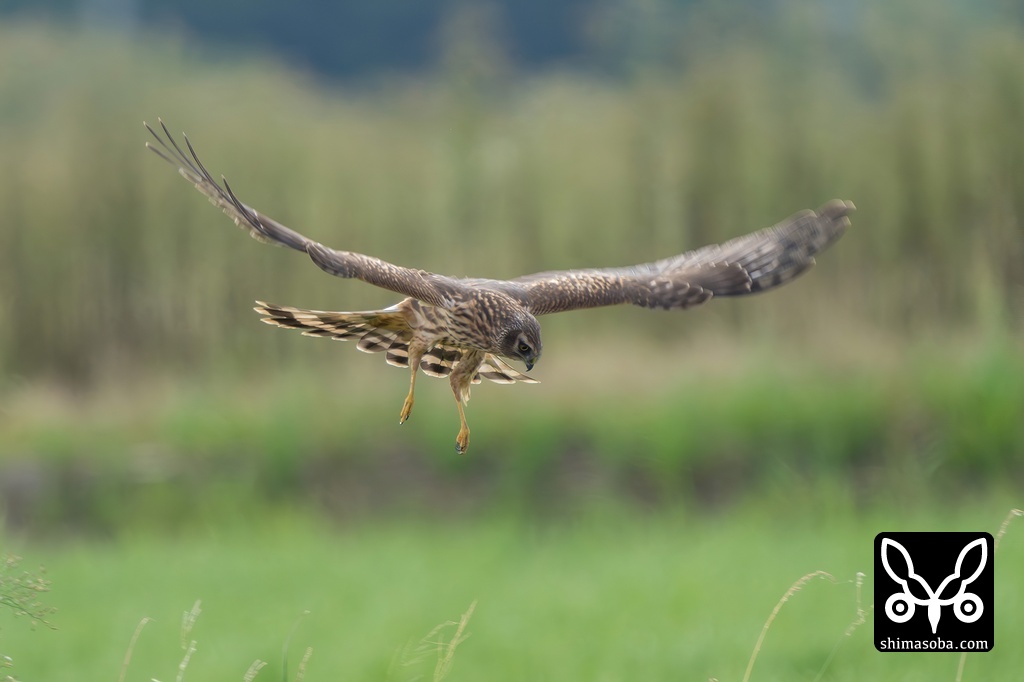 ハイイロチュウヒが田んぼを低く飛び回るたびにシギや小鳥たちはパニック。セイケイも大慌てで茂みに隠れてしまいます。