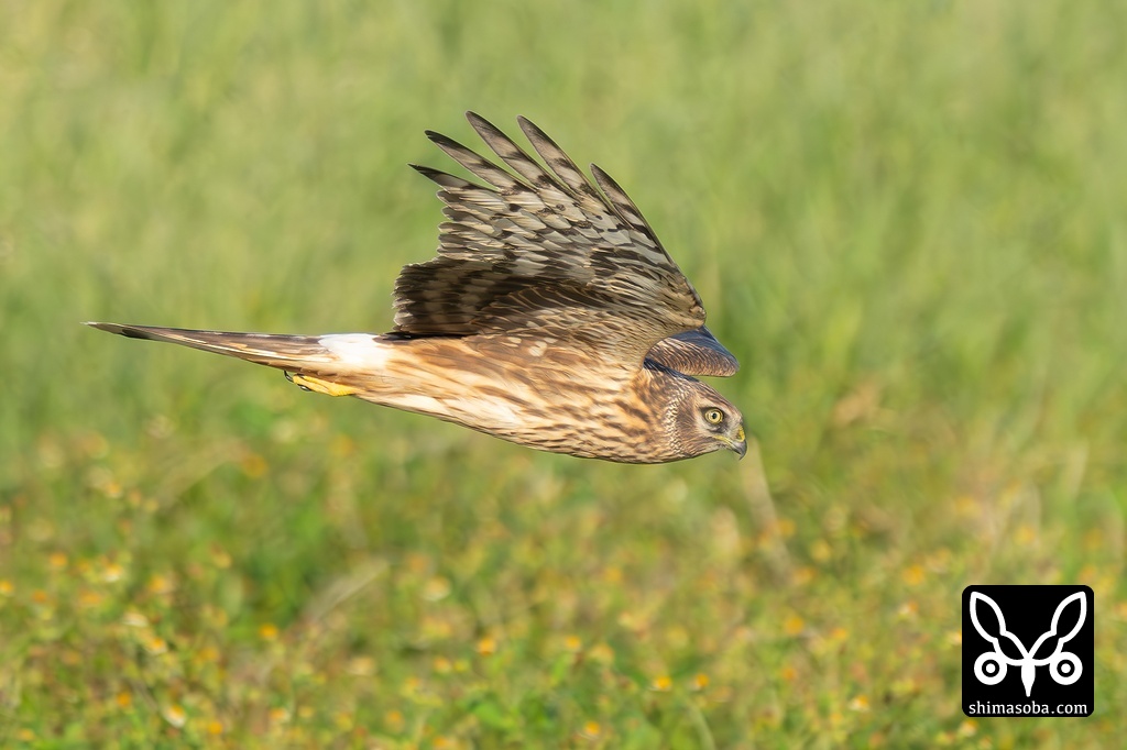警戒心の全くないハイイロチュウヒの幼鳥。非常いアグレッシブに狩りを行う個体で、風切羽の上面が泥で汚れています。