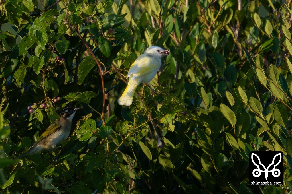 オオムラサキシキブの実を食う。左下には普通のシロガシラもいます。