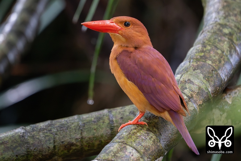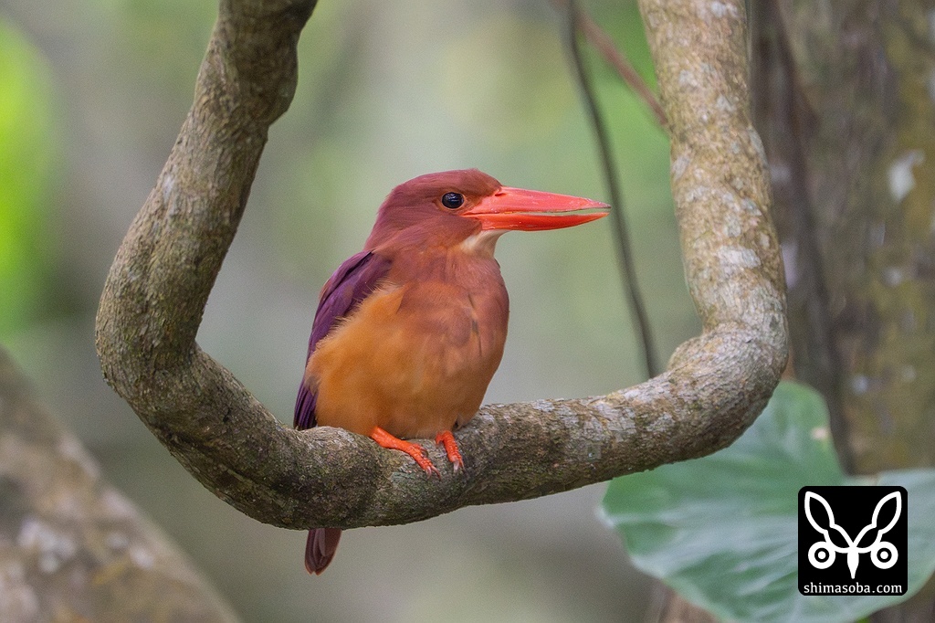 ブランコのようなツル植物に止まるアカショウビン。この個体は、すでにペアを形成していました。
