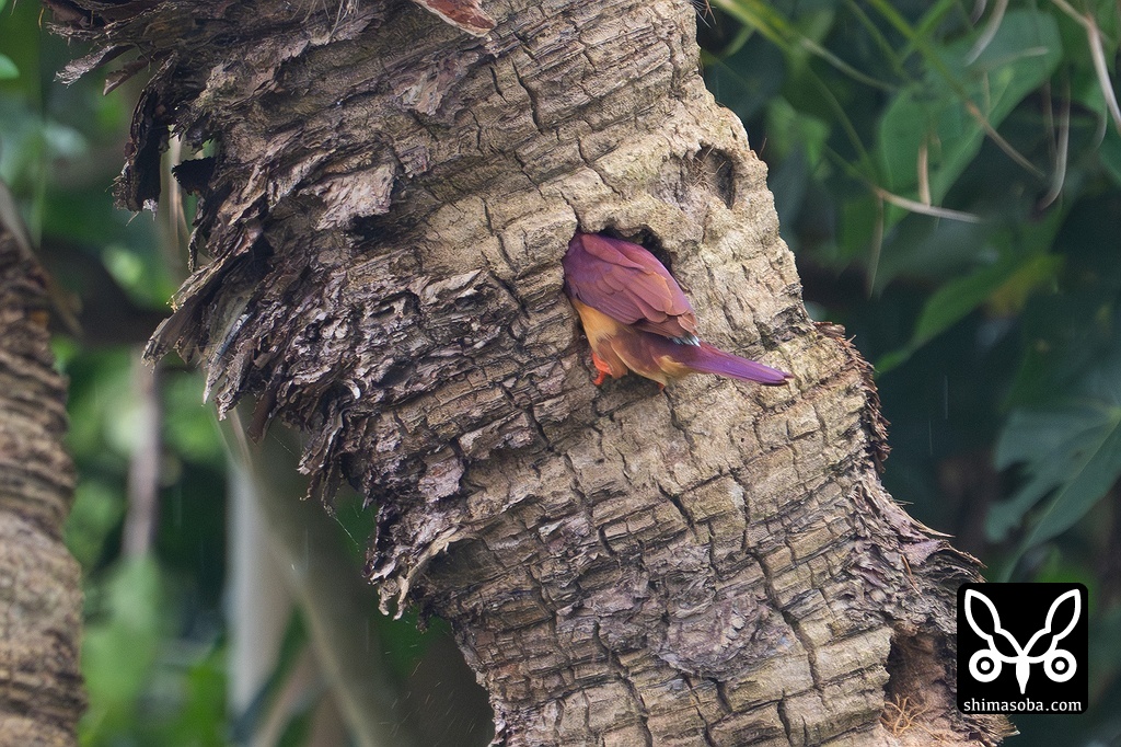 ビロウヤシに巣穴を掘るアカショウビン。この樹種は硬いので途中で諦める可能性もあります。