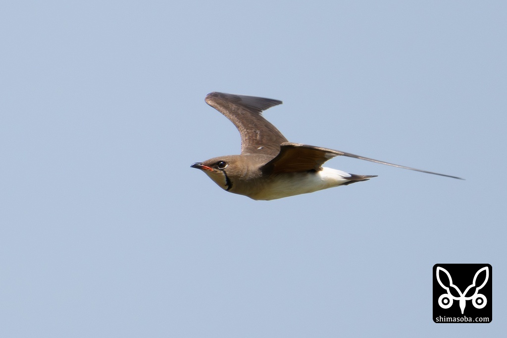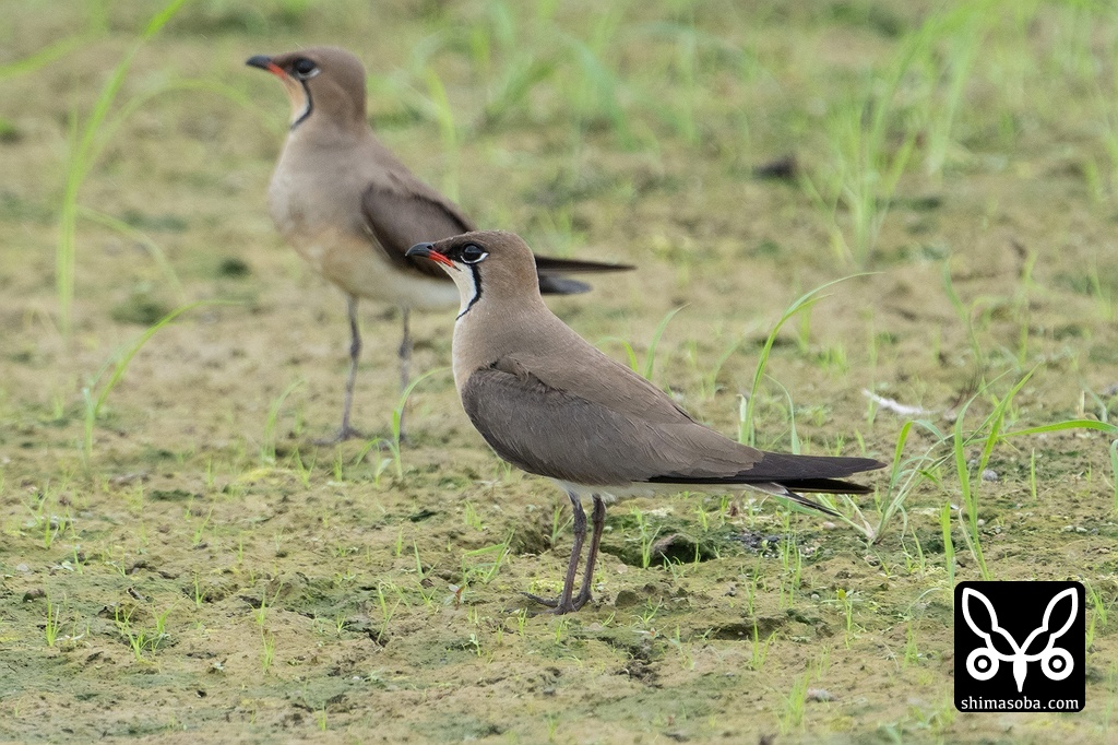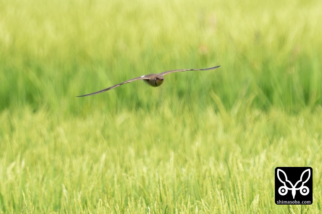 ツバメチドリの小さな群れは田んぼに入っていました。クロハラアジサシと同じエリアで虫をとりますが、クロハラアジサシはふわふわと飛んで稲に付いている虫を捕食。ツバメチドリは高いところで飛んでくる虫を襲っていました。