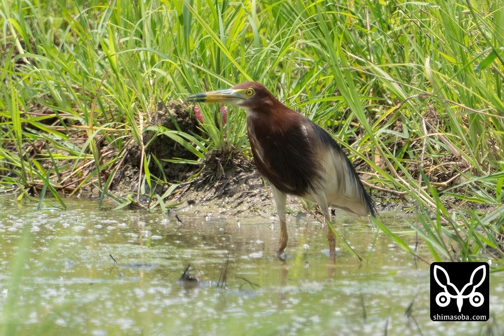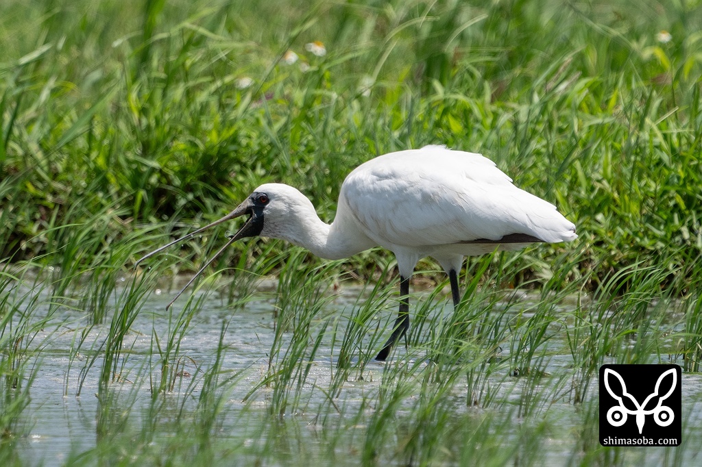 オタマジャクシを捕食するクロツラヘラサギ。若い個体です。