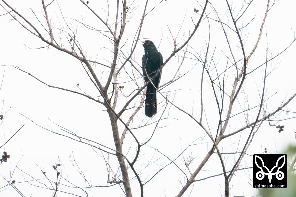 10分ほど観察しているとすぐそばの茂みからオニカッコウのメスの鳴き声。2個体いるようでした。メスの鳴き声に誘われるようにオス個体がいなくなったので付近を探索。オニカッコウの托卵相手と見られるオサハシブトガラスも巣を作っているようでした。これは繁殖の確認ができるかもしれないチャンスですね!!