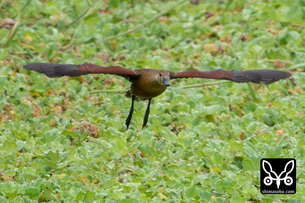 こちらへ向かって飛んできます。リュウキュウガモの特徴でもある長い足が目を引きますね。日本で記録のあるカモの仲間で飛翔時に足の長さが尾羽を超えるのはリュウキュウガモだけの特徴です。