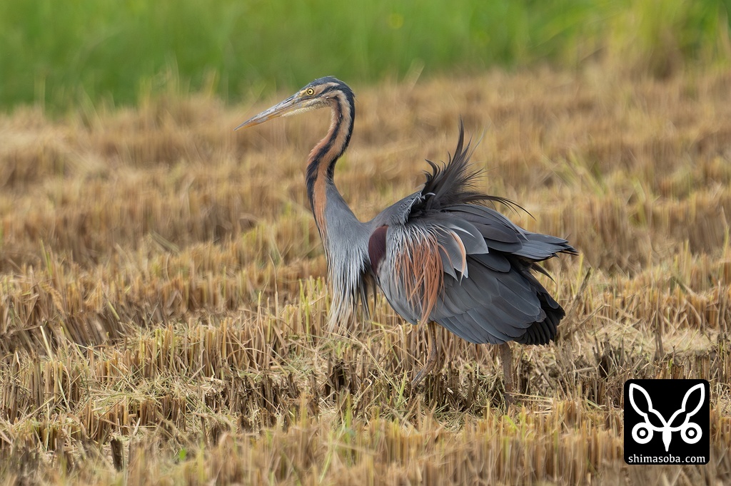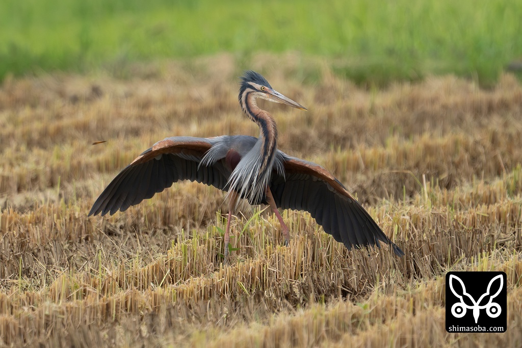 稲刈りが終わった田んぼではムラサキサギやアオサギ、チュウダイサギ、コサギなどが獲物を狙って集まっています。