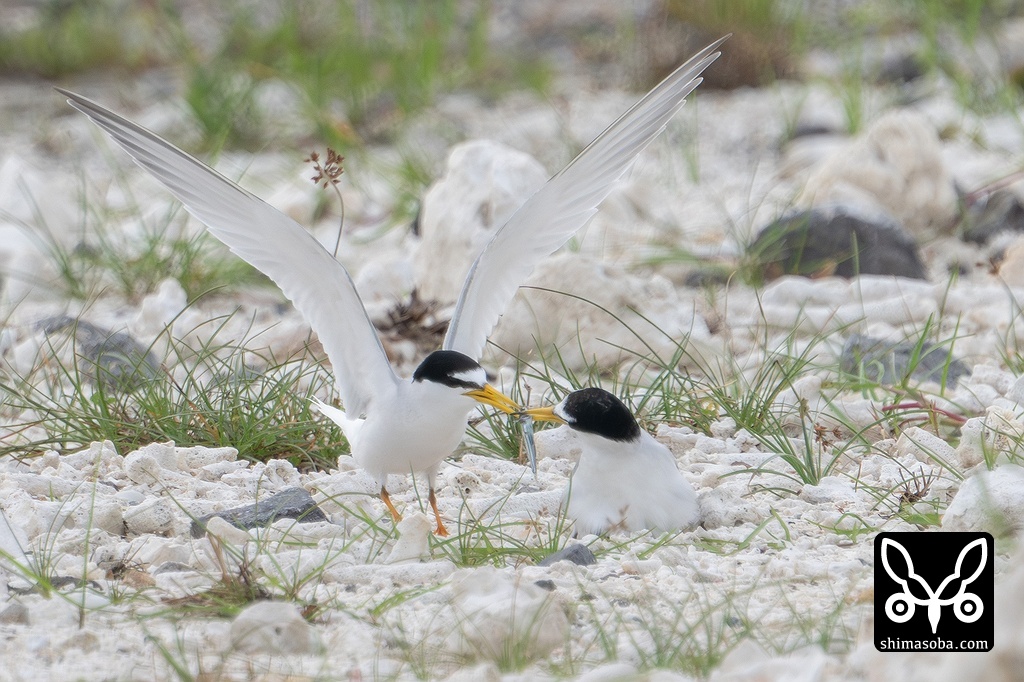 抱卵するメス(右)に餌を運んできたオス。鳥よけのために設置された猛禽類を模した凧に怯えながらなんとか給餌していました。