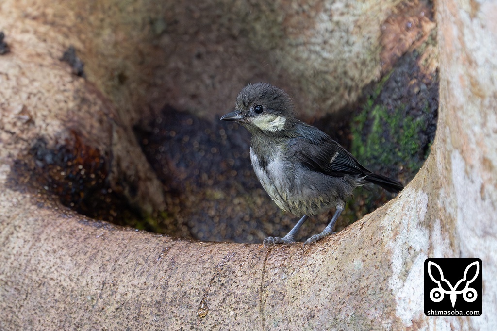 イシガキシジュウカラの幼鳥。木の窪みにできた水たまりで水浴びしていました。