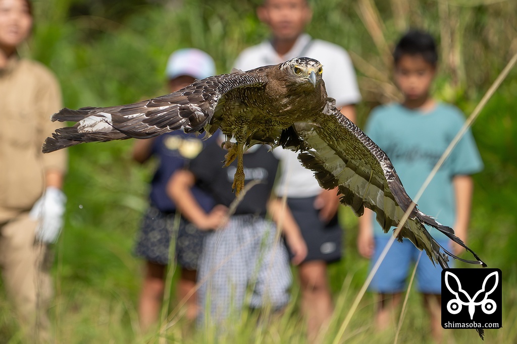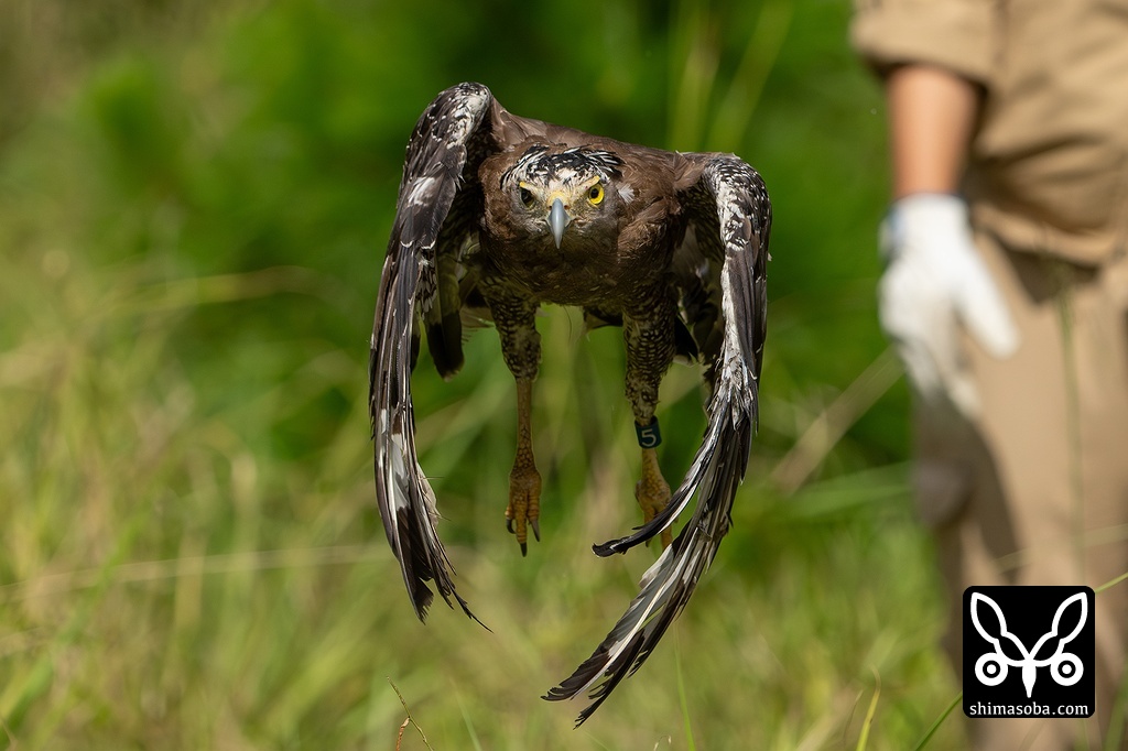 地面に置かれると迷うことなく飛び立ったカンムリワシの嘉例。左足には個体識別用の「5」が刻印された青い足環を装着。貴重な記録になるので、元気にしている姿を見つけた際はお知らせください。