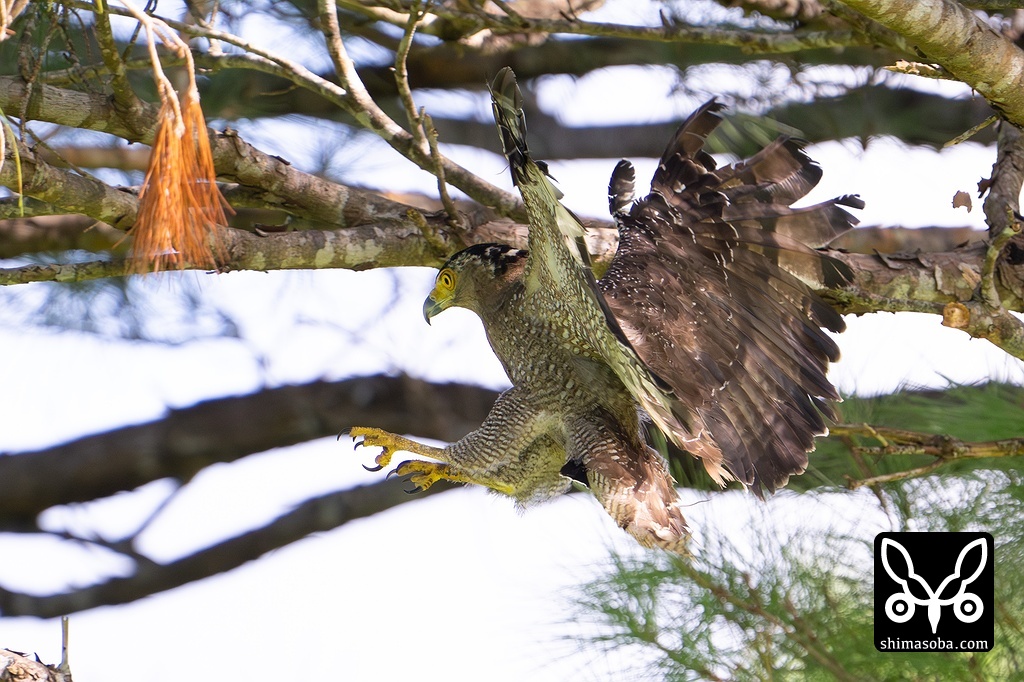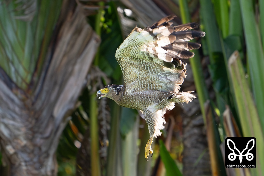 自然に放たれ、力強く羽ばたくカンムリワシ。右足に標識が見えます。