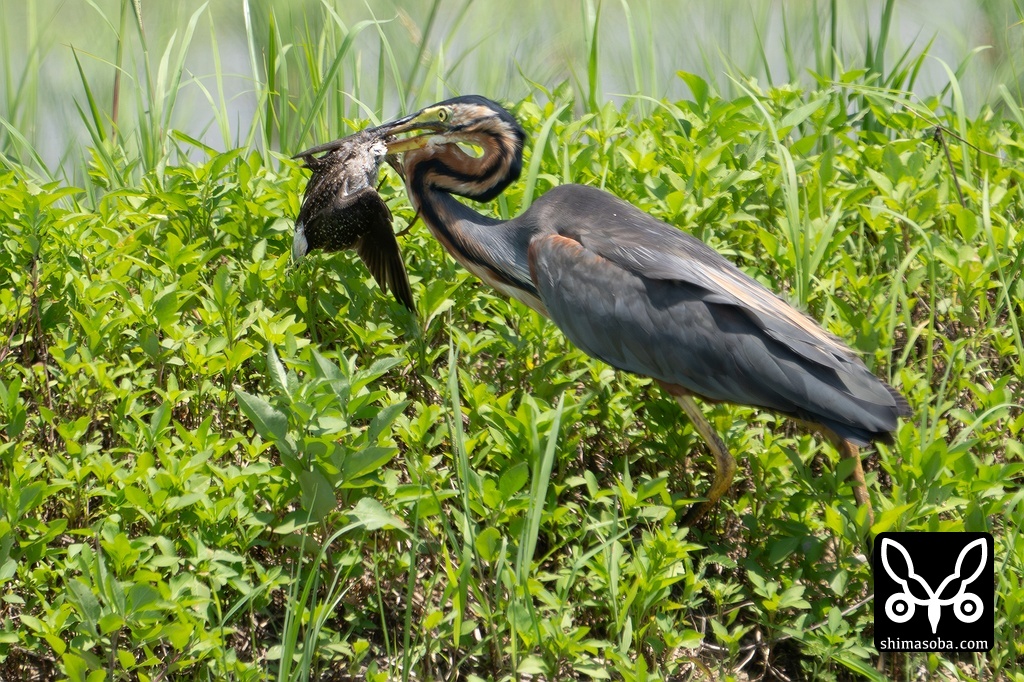 合宿最後の写真はこれ。ジシギを観察いていたら後ろがうるさくて気付きました。タカブシギを食うムラサキサギ。
