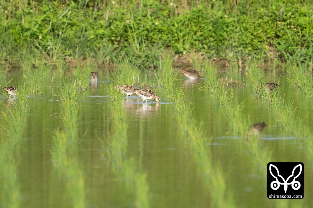 一番左がタシギでほかは全てチュウジシギ。