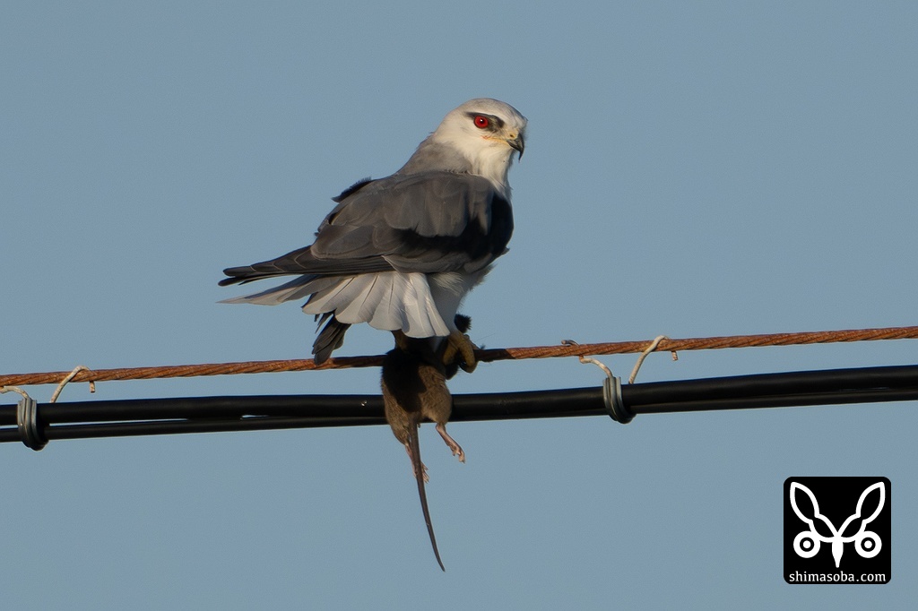 電線からしきりに草むらを気にしているカタグロトビの成鳥を発見。最初に止まっていた電線から一段低い電話線に移動。体の向きを変えると急降下しました。数秒後、草むらから飛び出てくると足には、すでに締められたクマネズミをつかんでいました。