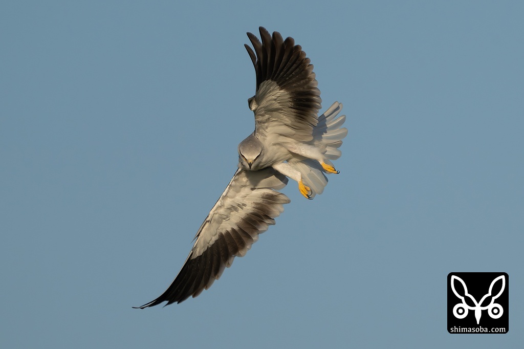 草むらに向かって急降下するカタグロトビ。