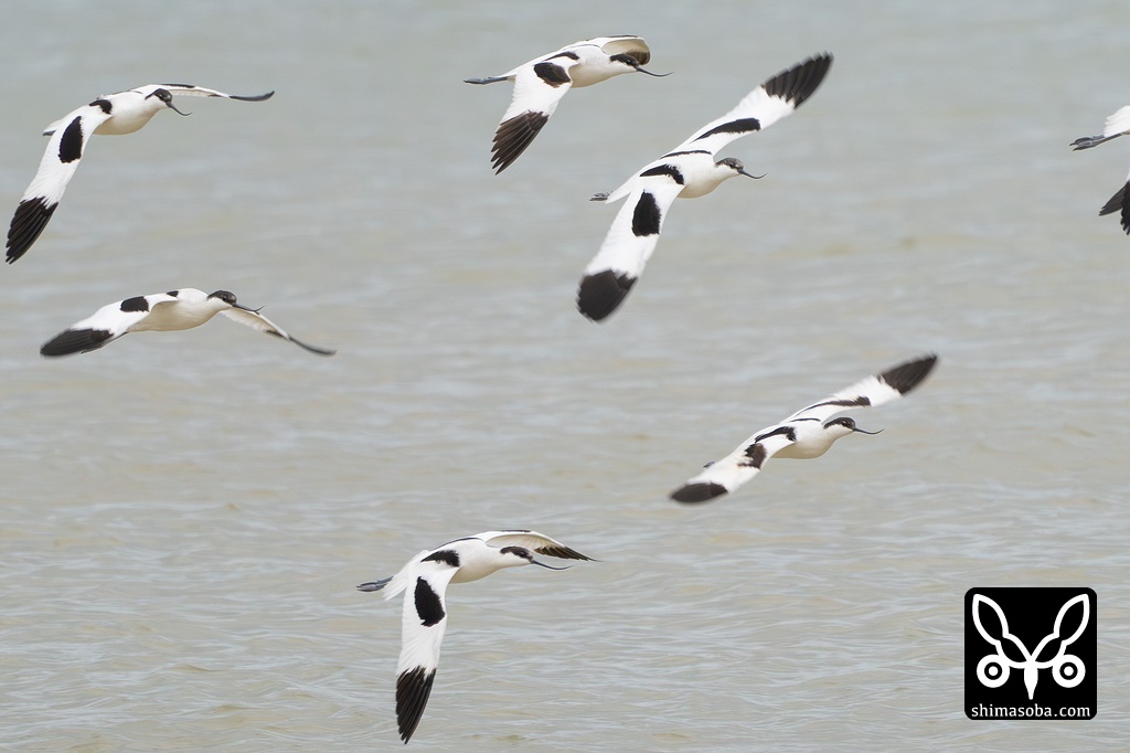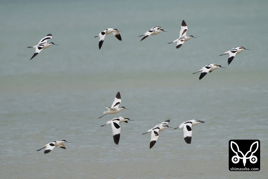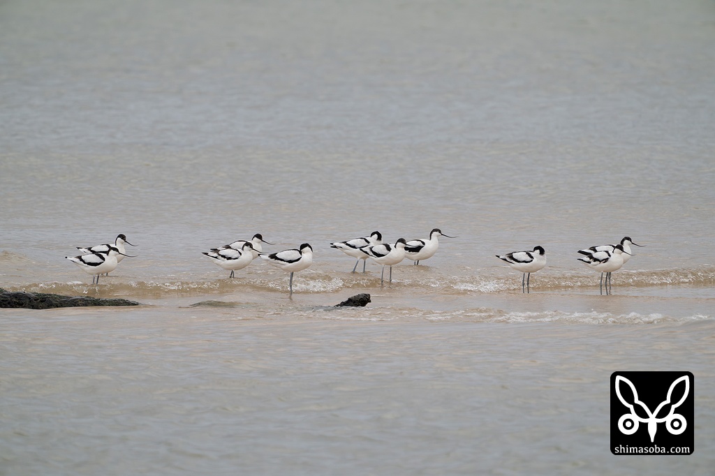 ソリハシセイタカシギ11羽の群舞。モノトーンなソリハシセイタカシギと曇天でアッシュグレーに染まる海が枯淡な雰囲気を醸し出します。