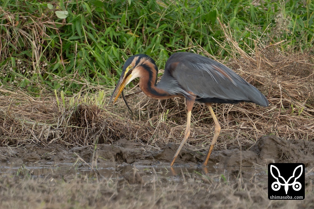 タウナギを呑むムラサキサギの成鳥。