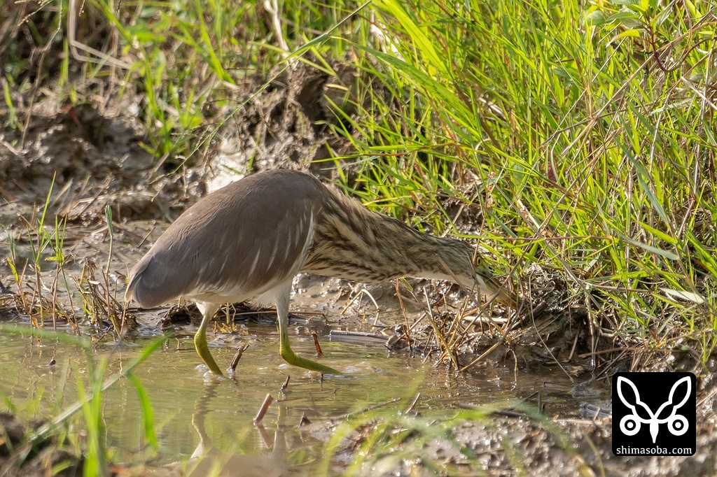 獲物を捕まえたズグロミゾゴイ。一気に引き抜くことができず、少しずつ引き上げていましたが、車が横を通ったので驚いて逃げてしまいました。