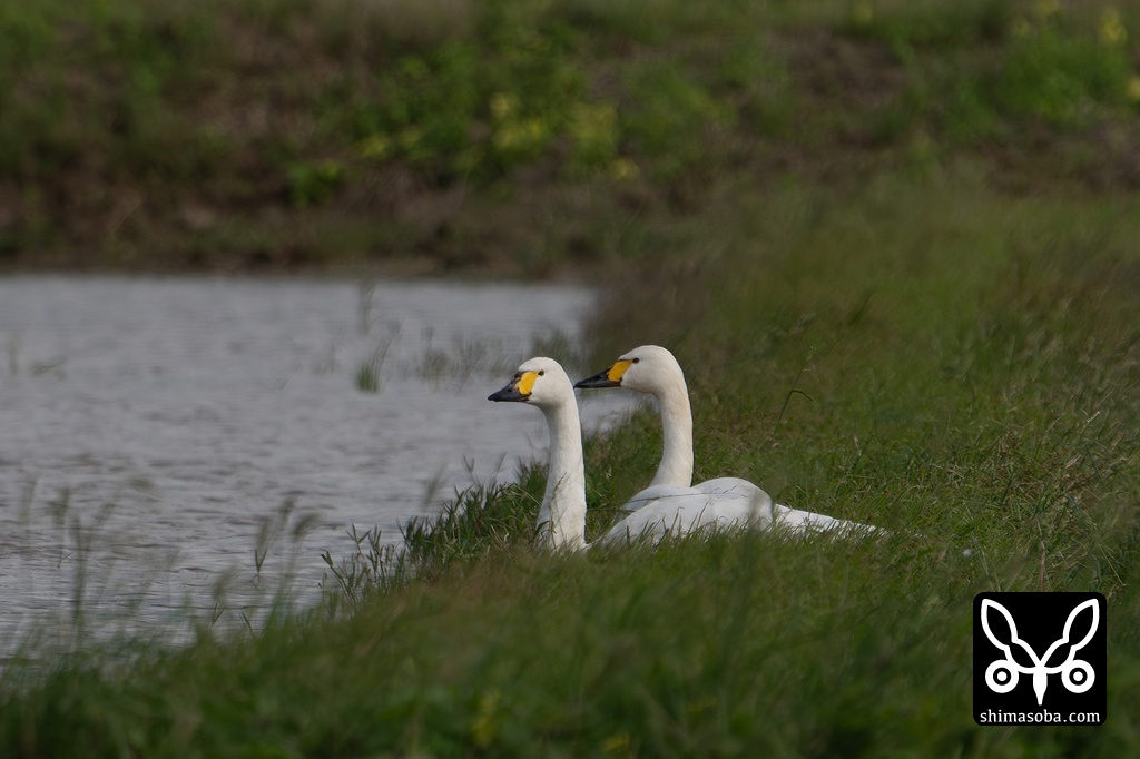 コハクチョウ2羽。西表島から移動してきた個体です。ダム湖や海岸、田んぼを転々としています。