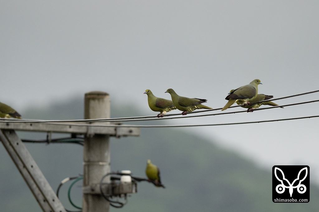 自宅のリビングから撮影したチュウダイズアカアオバトの群れ。毎日、10羽程度がクワの実を食べにやってきます。