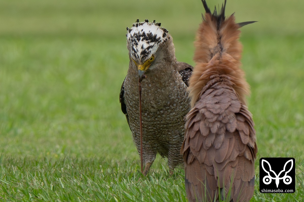 ズグロミゾゴイが捕まえた獲物の大きなミミズを食うカンムリワシ。