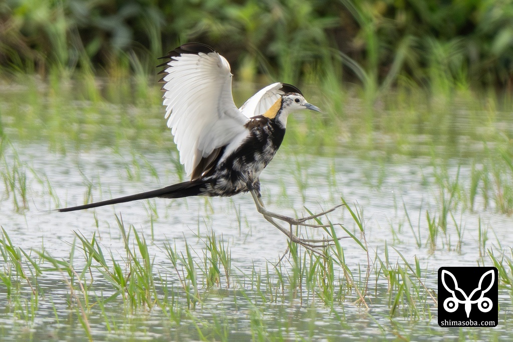 カラスに驚いて飛び上がったレンカク。第1回夏羽の若い個体のようでした。