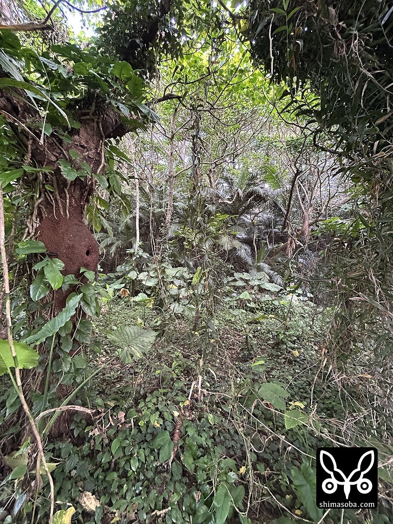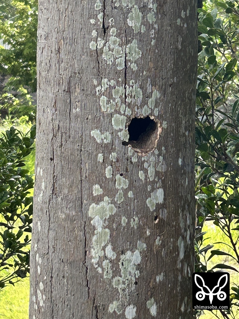 集落内で毎年、アカショウビンが巣作りするヤエヤマヤシの立ち枯れ。上の方から使うので年々、巣の位置が下がり、今季は腰ぐらいの高さになってしまいました…。^^;