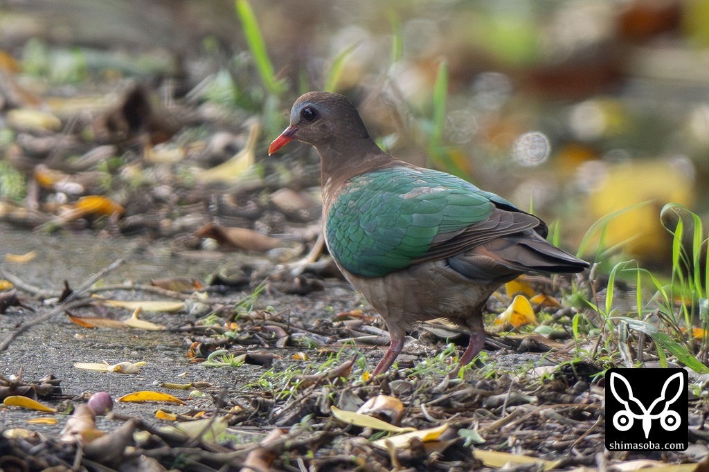 キンバトのメス。こちらもオオバギの落果を採餌。側溝にたまった水も飲んでいました。