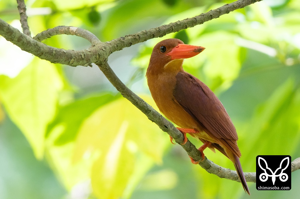 牧場内の木陰にいたアカショウビン。餌をとると、私の頭の上を越えて森の中に飛んでいきました。