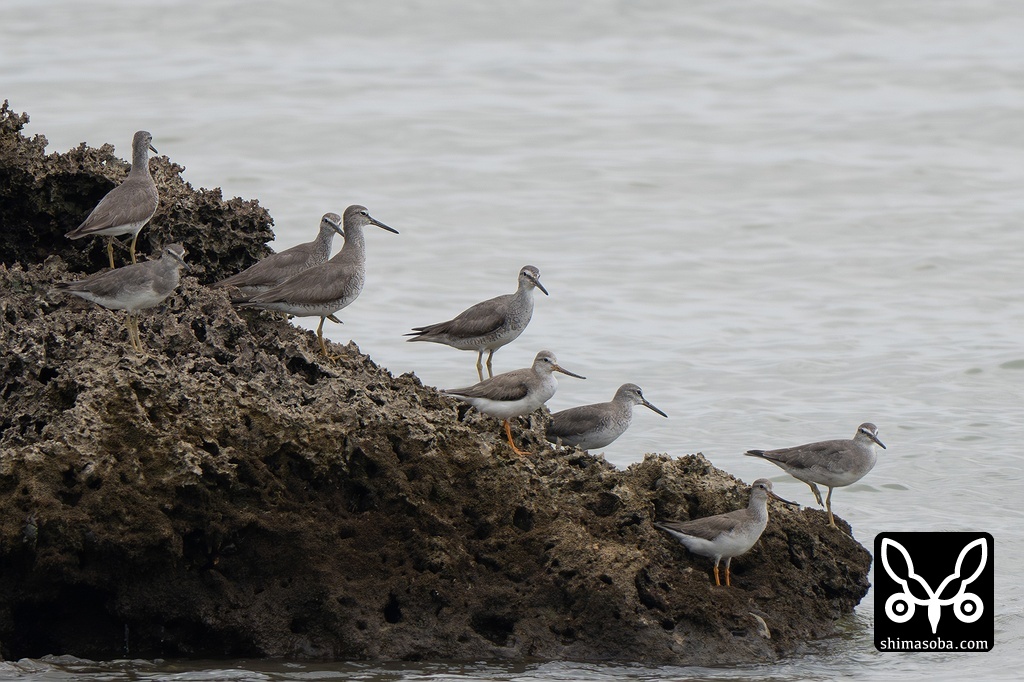 満潮に近くなると海岸の岩礁には、キアシシギとソリハシシギが集まりました。