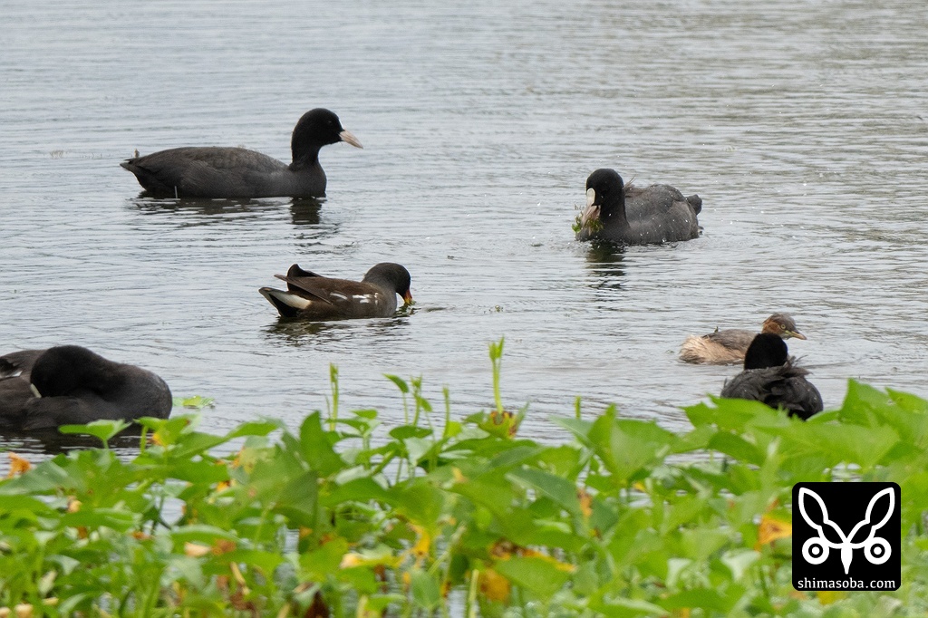 越冬オオバンと地元のバンは池で仲良く採餌。