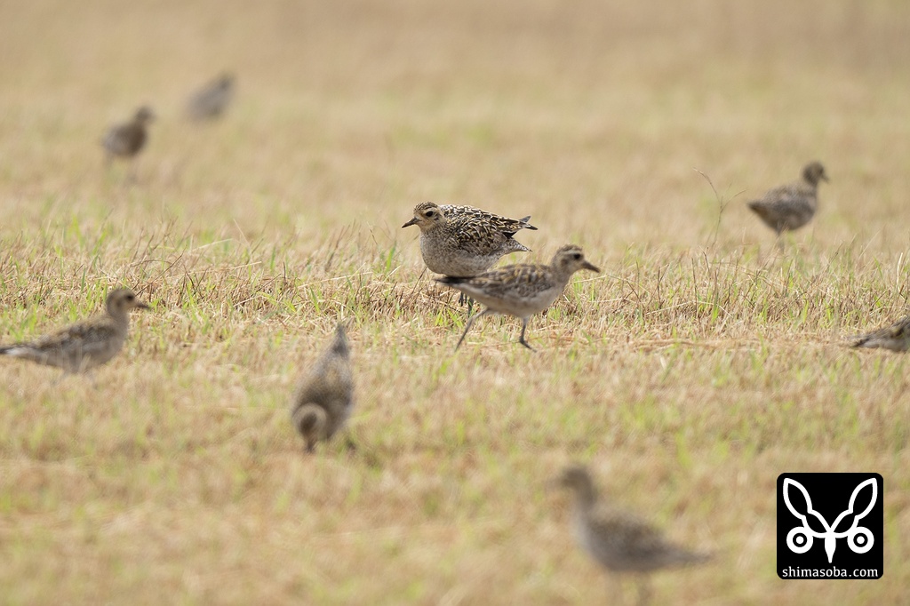 牧草地にムナグロ60羽の群れが降りてきました。どんな鳥でも群れはいいですね。
