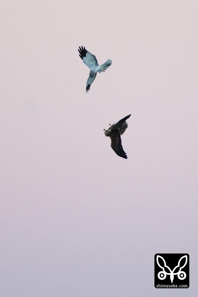 ハイイロチュウヒのオスとメスがじゃれていました。
