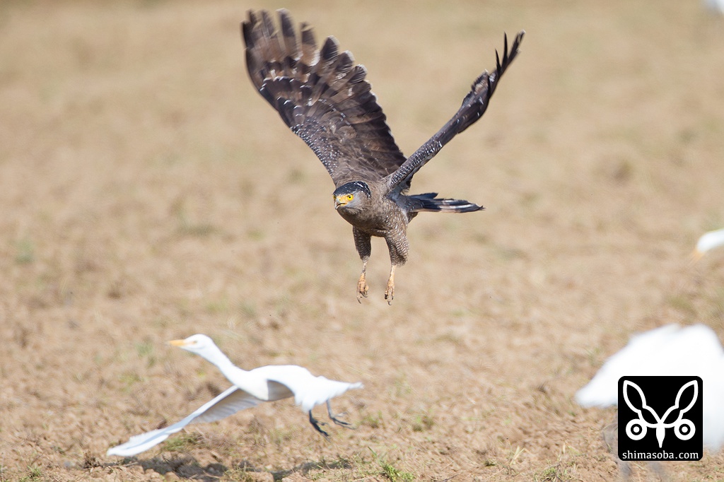 サギを蹴散らすカンムリワシ。