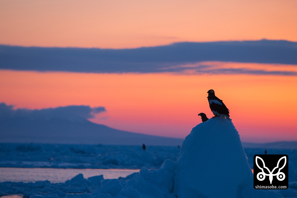 日の出間近。流氷の上ではすでにワシたちが起きています。
