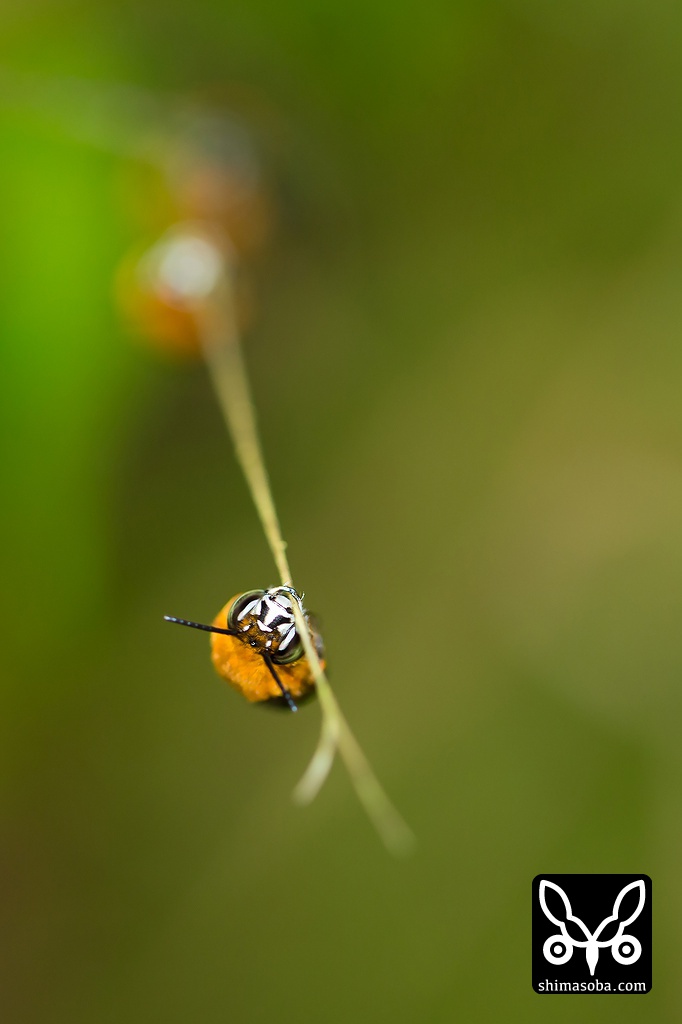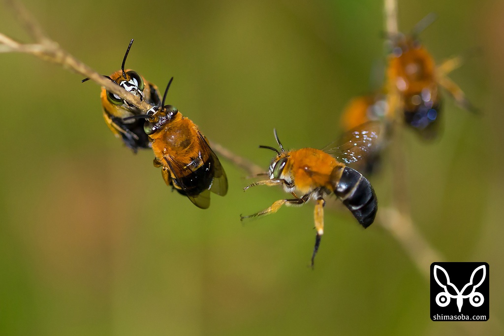 夕方になるとアオスジコシブトハナバチが枝などに鈴なりになって寝ます。まるっこくてかわいらしいハチです。