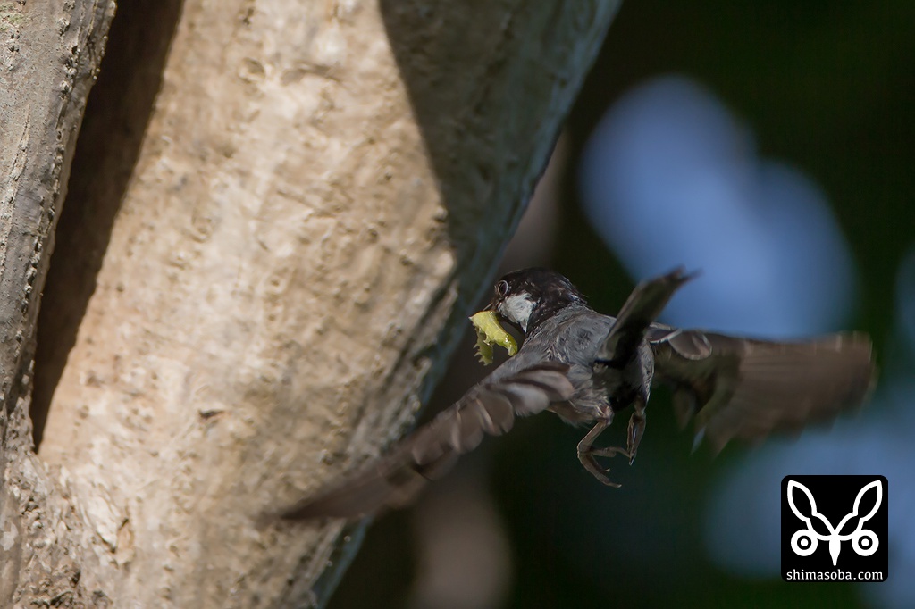私のいる横の木でイモムシを捕まえて巣に運んでいきました。以前は、レンズの先端に止まられたことがあります。^^;