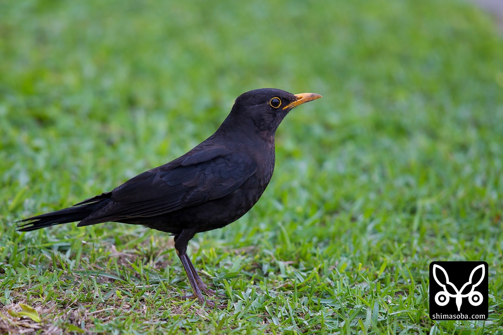 お立ち台に乗ってくれることを期待しましたが、だめでした…。^^; クロウタドリのオスは、黄色いアイリングと暗い虹彩がつぶらな瞳を演出して可愛らしですね。