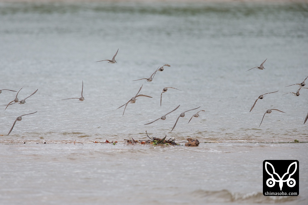 キアシシギとキョウジョシギが飛行機の音に驚いて飛びました。