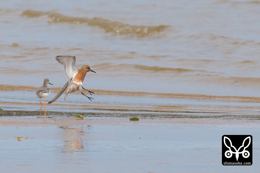コオバシギ。手前で水浴びするのはキアシシギ。