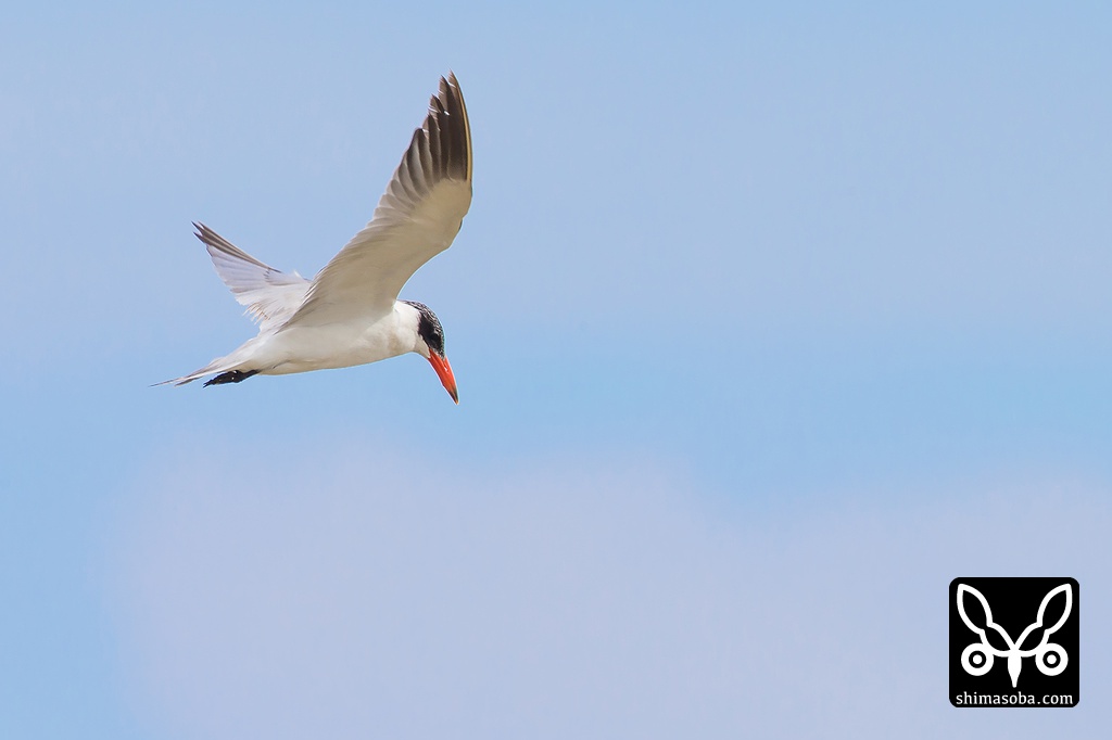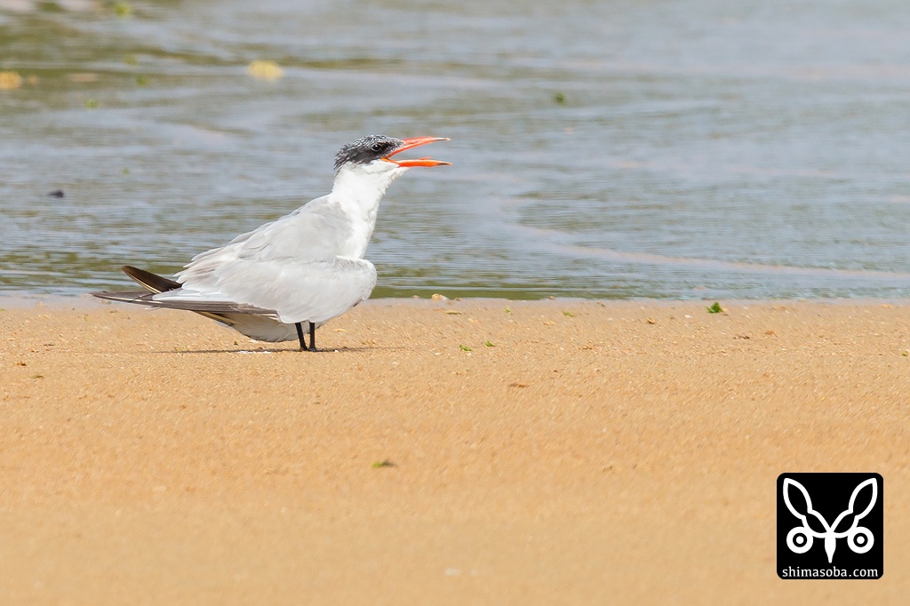 宮良川河口でオニアジサシが休んでいました。飛ぶには不自由していませんが、左の翼が下がり気味です。